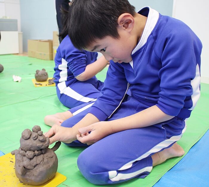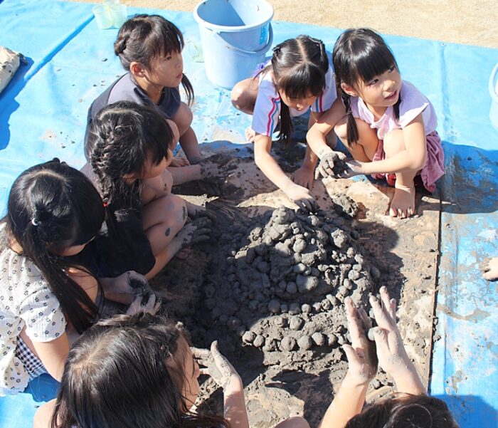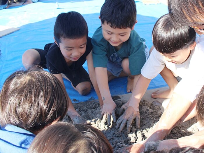 こちらの園では毎年卒園制作に先がけて粉状の粘土に水を混ぜて「つちねんど」を作る活動を行っており、かねてから自然素材としてのねんどに親しんでいます。